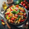 Ingrédients : Pâtes (penne, fusilli, etc.), pois chiches cuits, concombre, tomates cerises, poivron rouge, poivron vert, persil frais, jus de citron, huile d’olive, sumac, sel, poivre