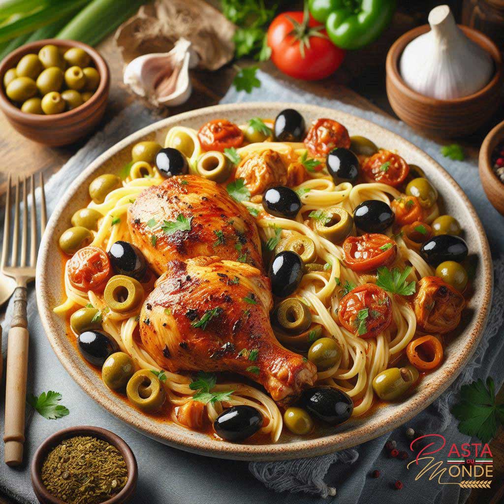 Découvrez l’alliance parfaite des saveurs marocaines et italiennes avec notre Tajine de Poulet aux Olives avec Pâtes Italiennes. Des cuisses de poulet dorées mijotent avec des légumes frais, des épices aromatiques, et des olives vertes dans une sauce tomate savoureuse. Accompagné de pâtes italiennes al dente, ce plat offre une fusion unique et délicieuse. Chaque bouchée est un voyage culinaire, rehaussé par une touche de coriandre fraîche. Parfait pour un repas réconfortant, ce tajine revisité ravira vos papilles et émerveillera vos invités.